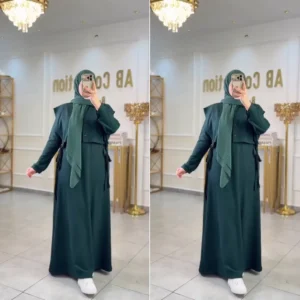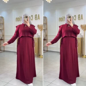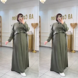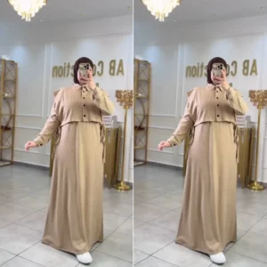 فستان طويل واسع مع سترة فوقه يضيف لمسة فخامة وأناقة مميّزة لكل إطلالة.
