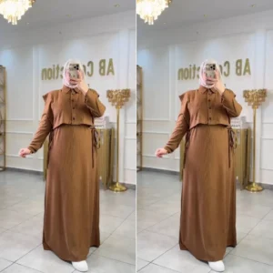 • تصميم مكوّن من قطعتين (فستان + سترة) يعطي إطلالة فخمة ومختلفة.