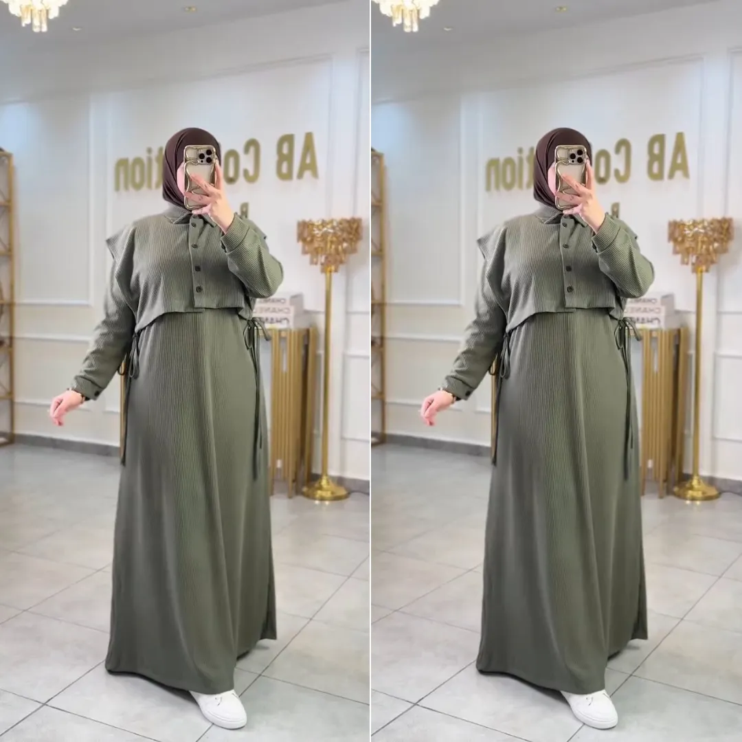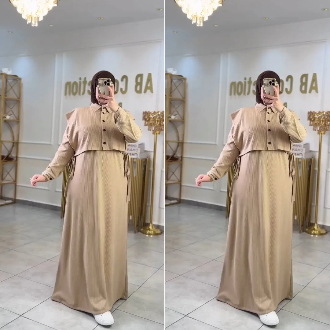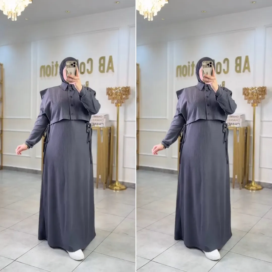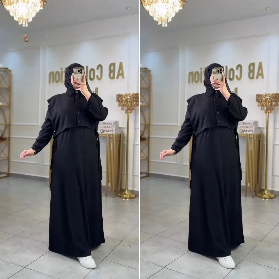 فستان طويل واسع مع سترة فوقه يضيف لمسة فخامة وأناقة مميّزة لكل إطلالة.